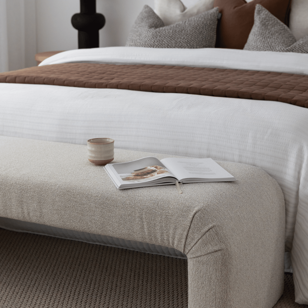 The Camilla Ottoman features an exquisitely curved profile and is the perfect finishing touch to the foot of a bed or lounge room scheme to truly elevate the space. Fully upholstered in a beautifully textured neutral fabric.