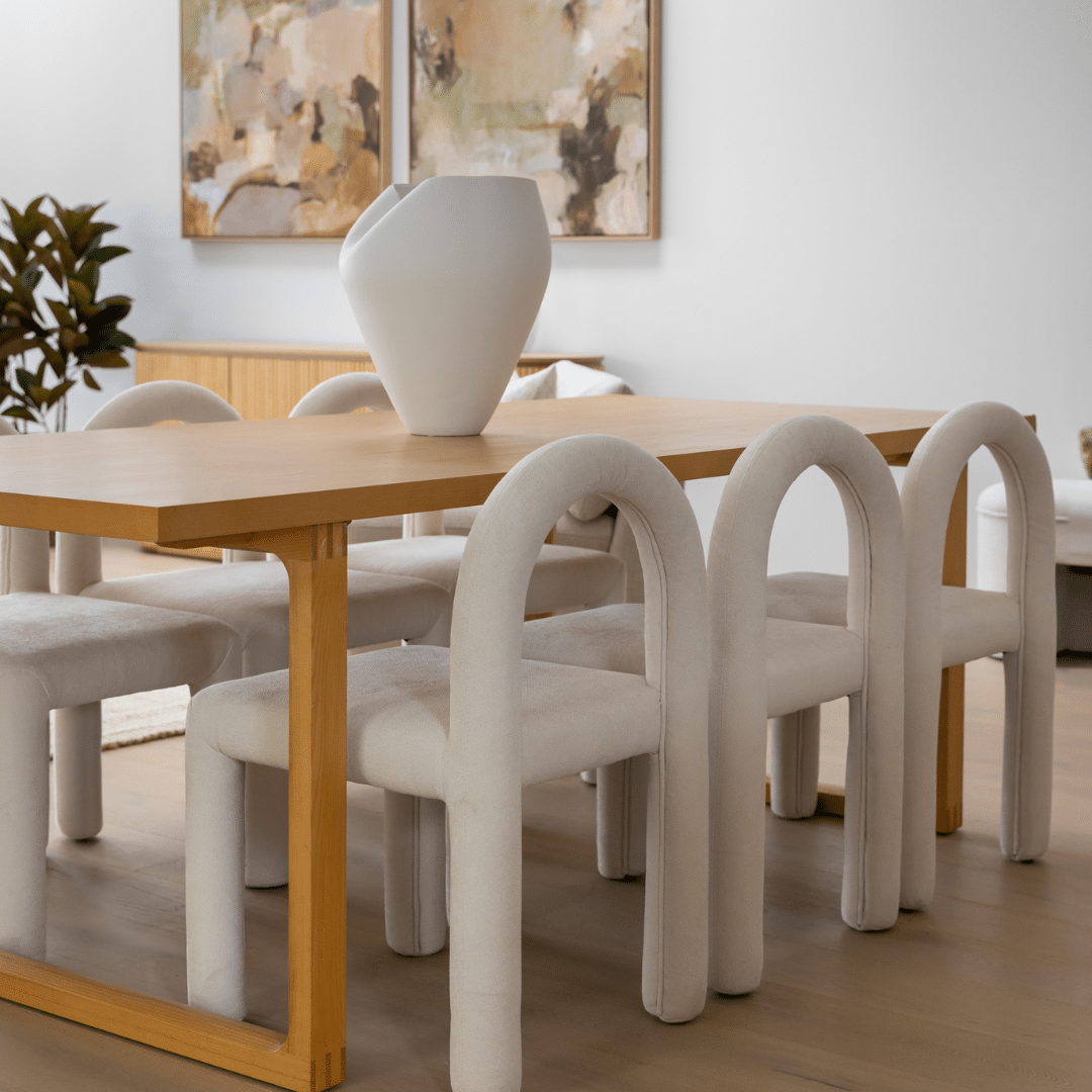 Elevate your dining space with the contemporary Cub Dining Chair, fully upholstered in a linen like fabric and sporting a striking yet minimalist silhouette. Featuring a modern arched backrest and rounded legs, this stunning chair is sure to bring impact to your space.