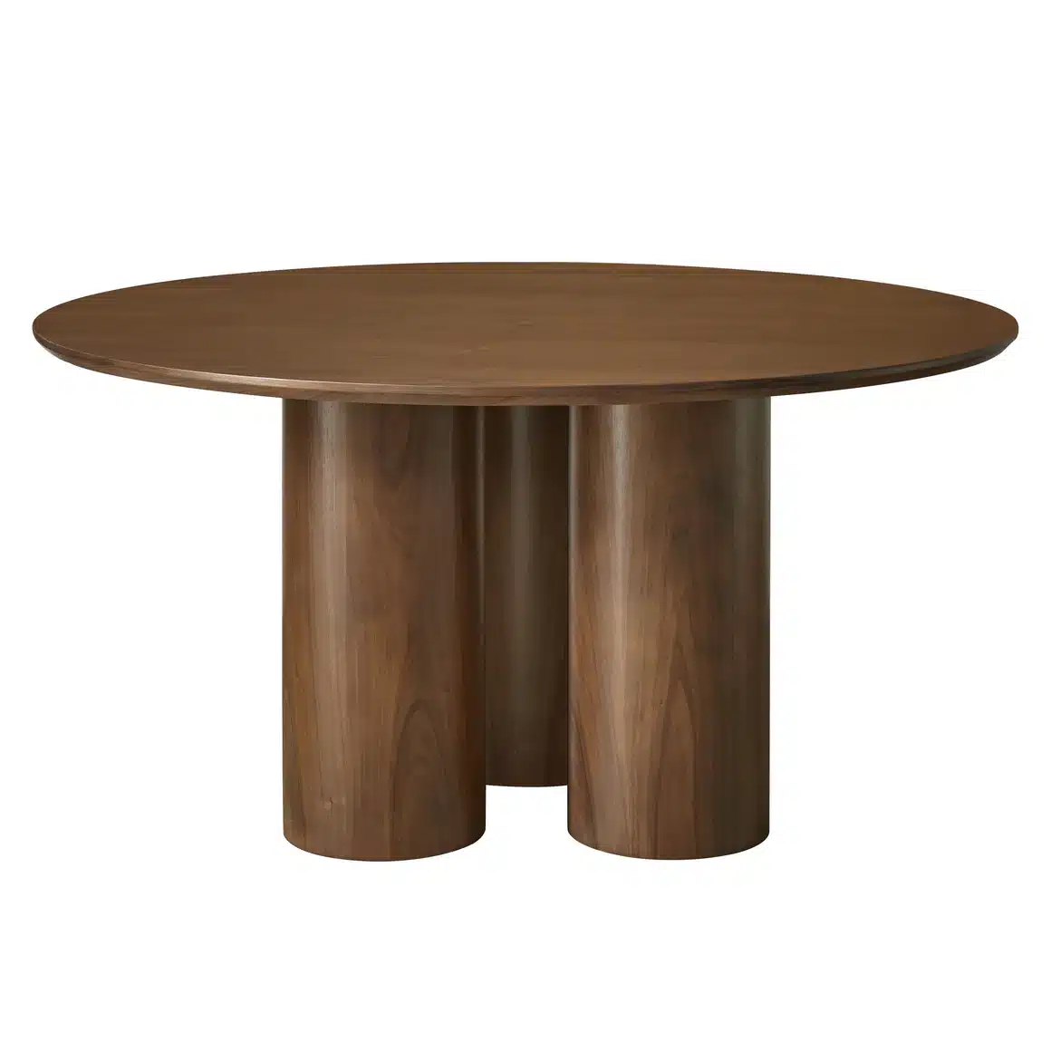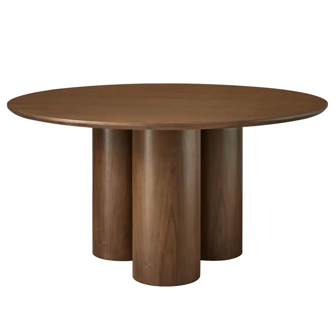 A bold statement in contemporary design, the Jules Round Dining Table features a sculptural silhouette with a striking cylindrical base. Crafted from premium timber veneer, it showcases a rich wood grain in a walnut finish.