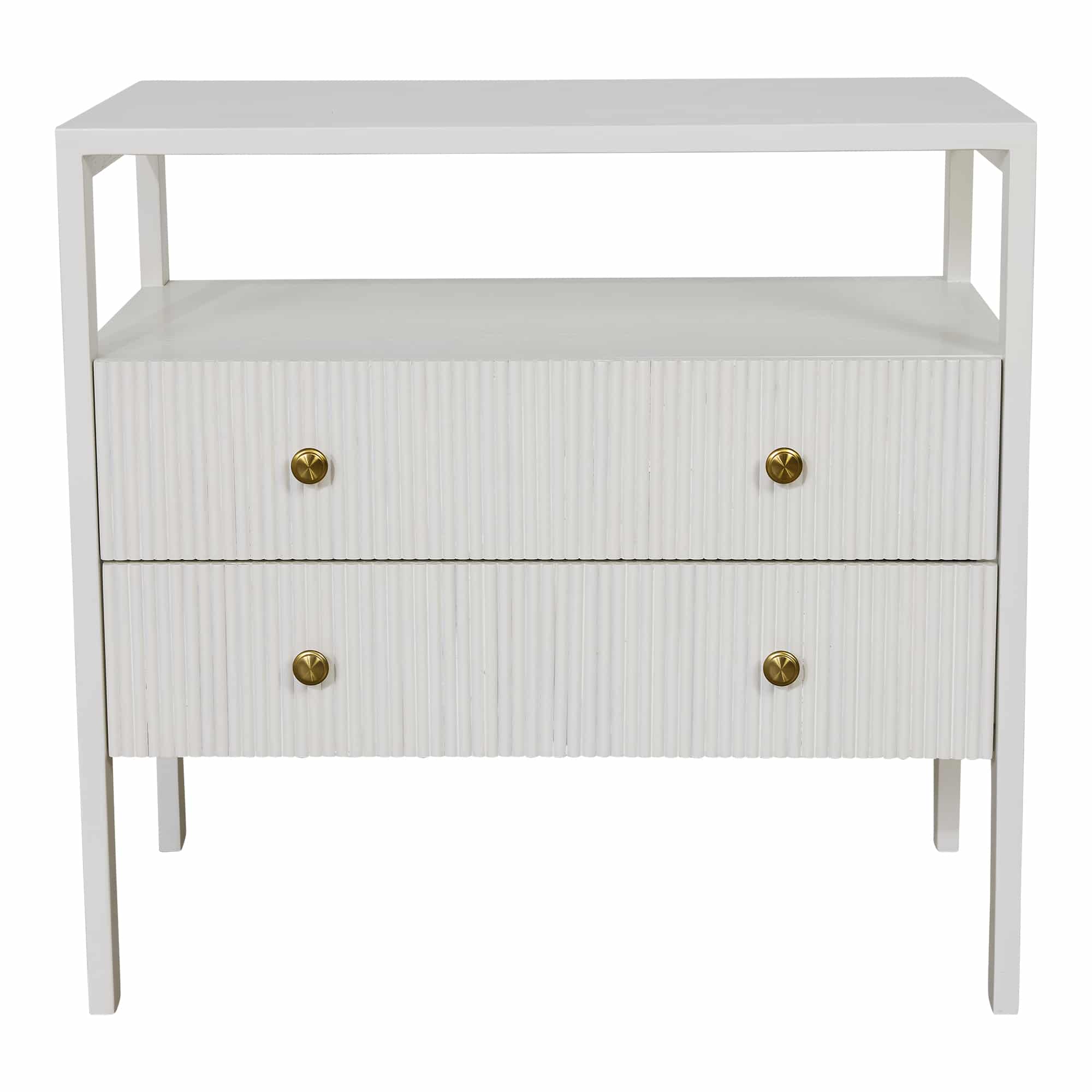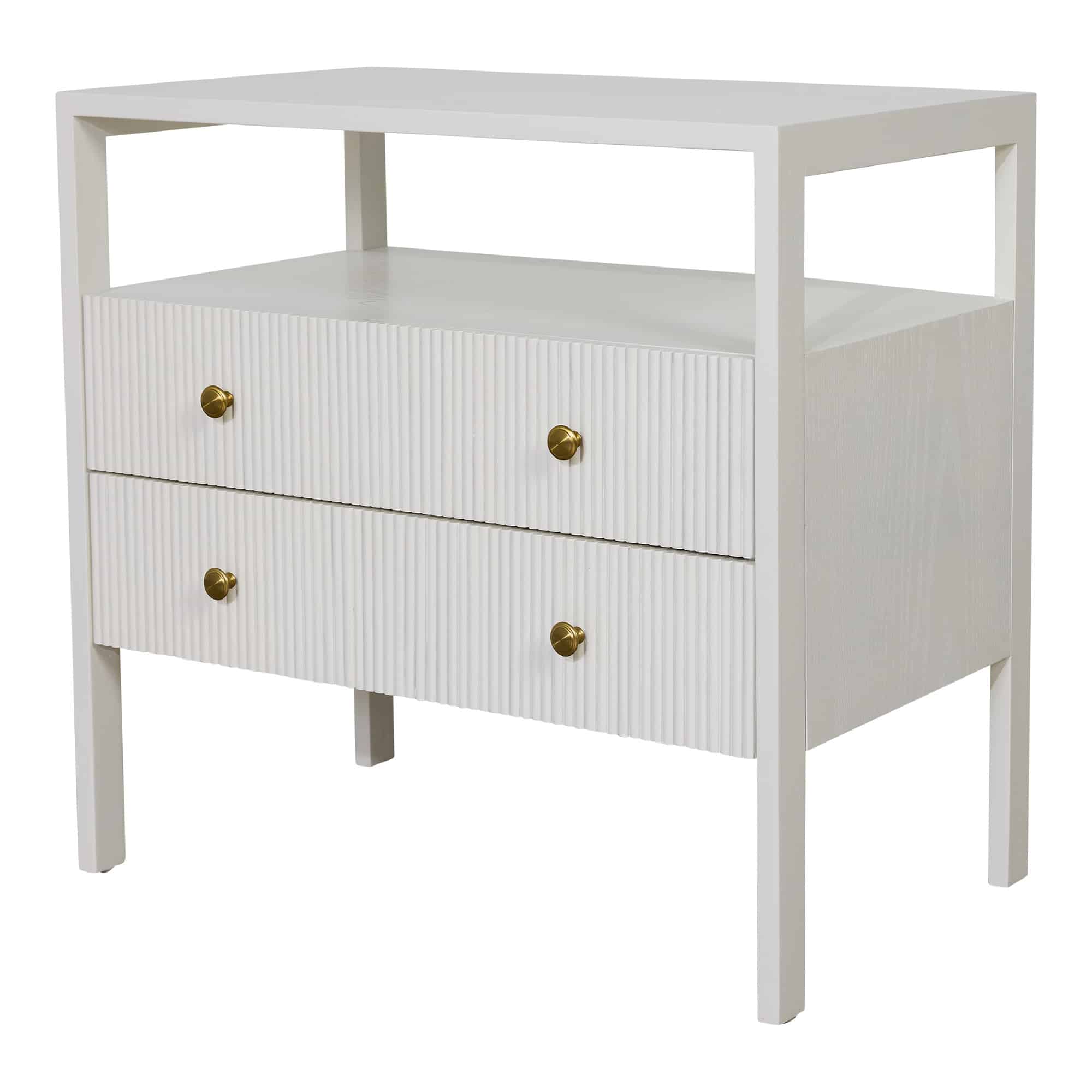 Elevate your bedroom styling scheme with these substantial sold timber bedside tables. Showcasing a narrow fluted timber design with brass pulls, this beautifully crafted bedside table brings texture and elegance to your space. Also available in Black and Oak.
