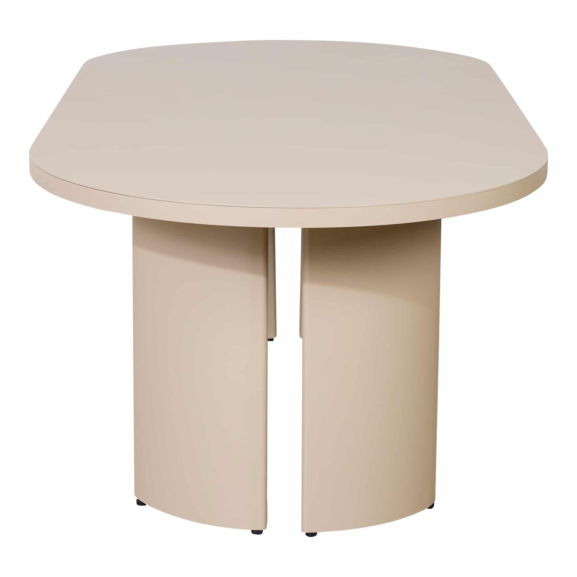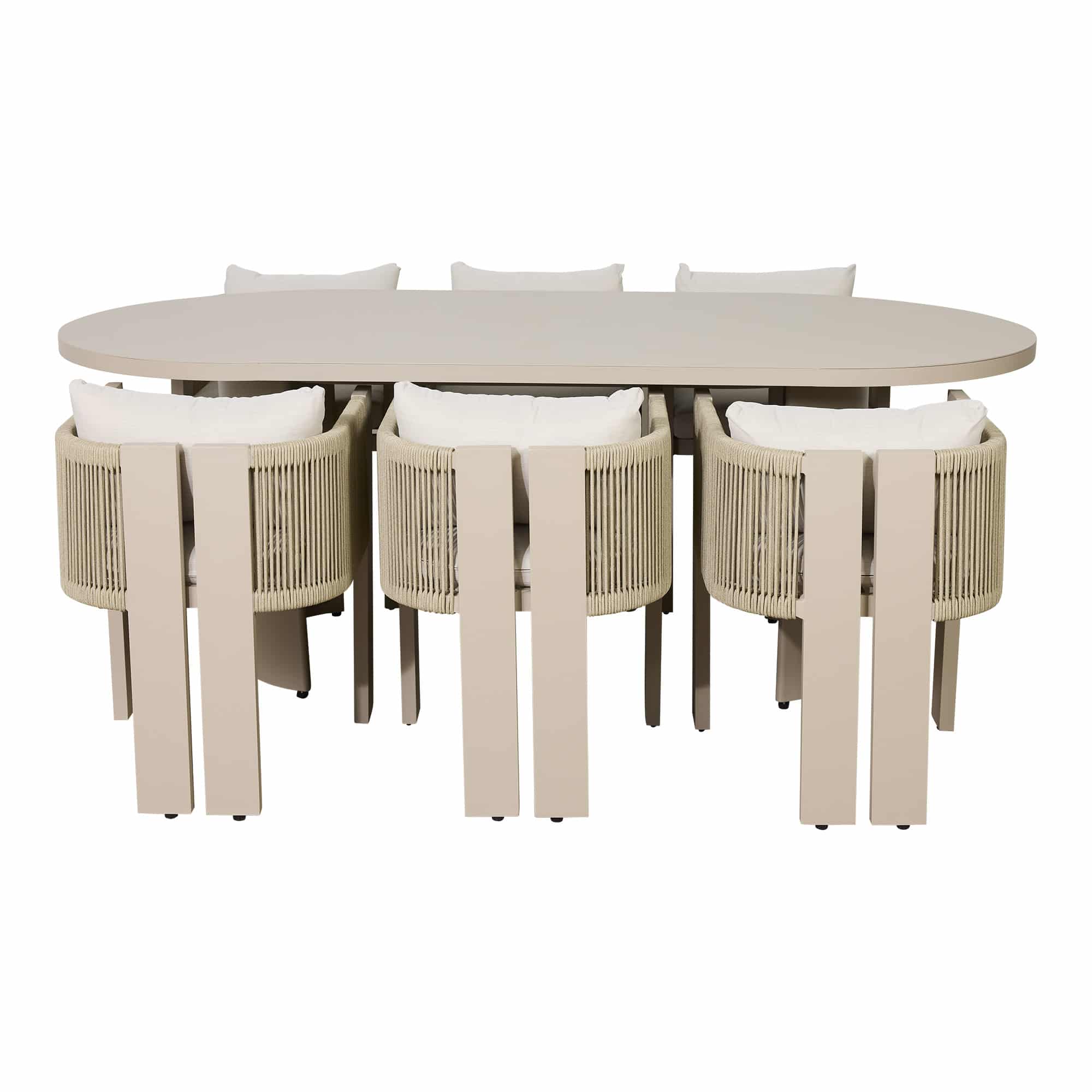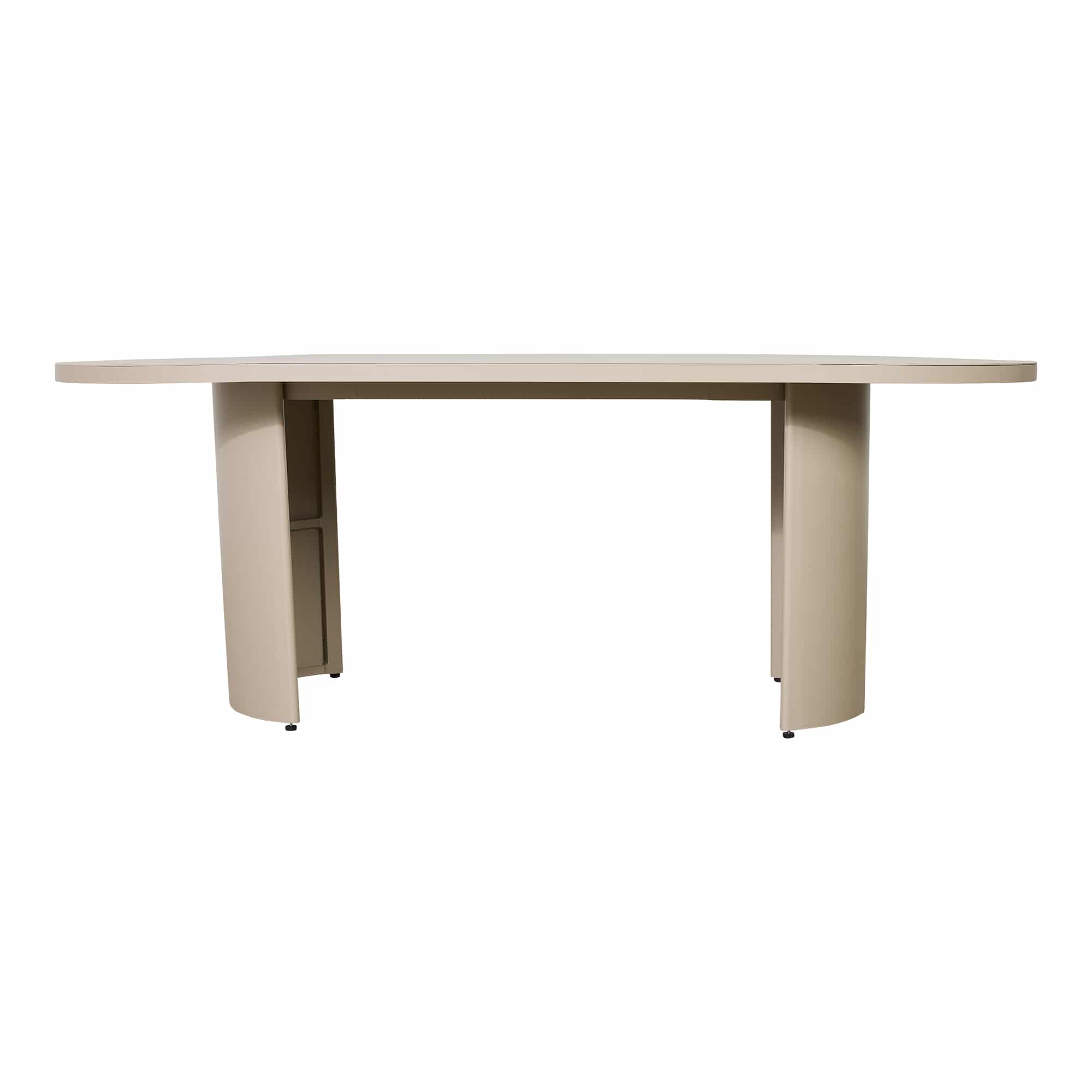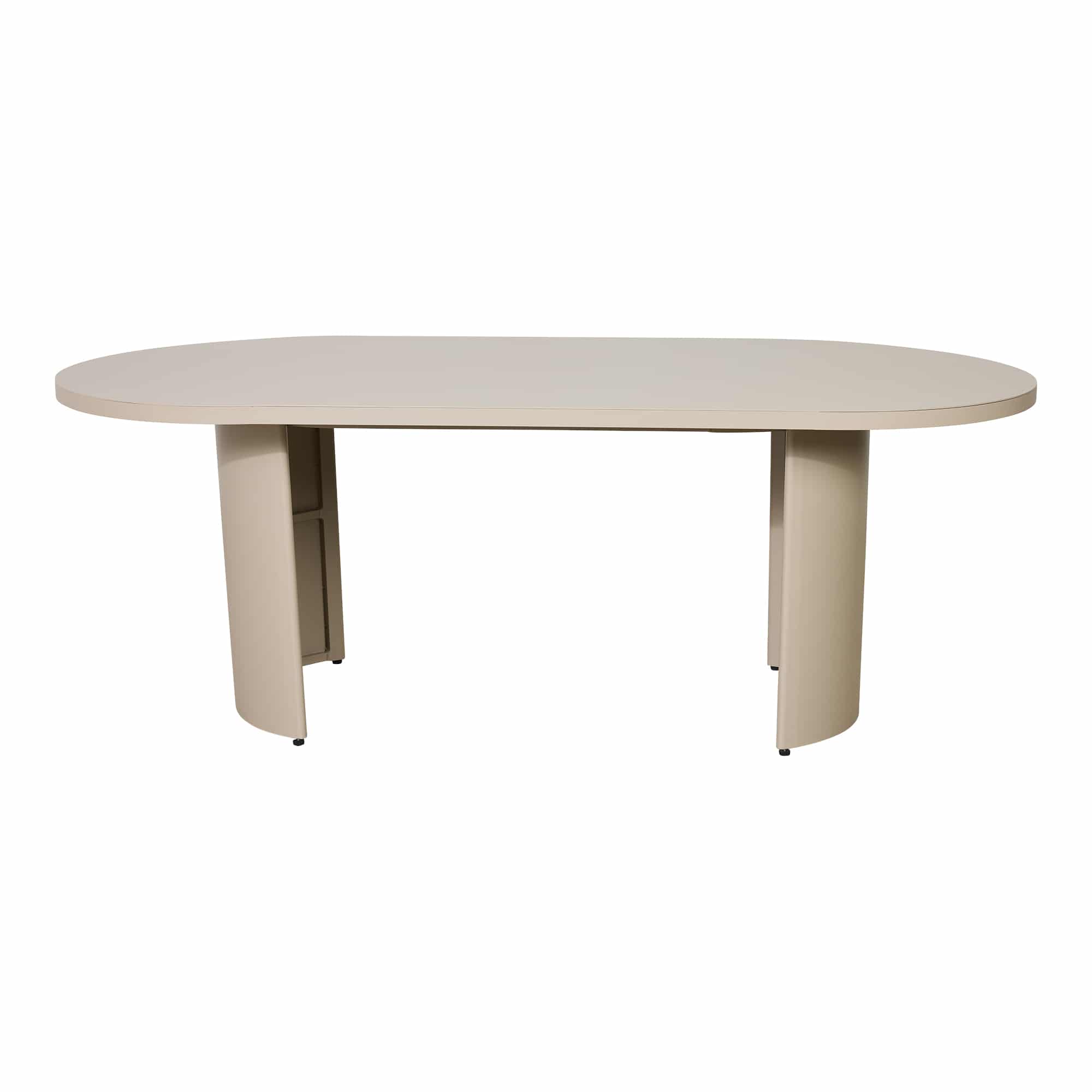 The Pascal Oval Outdoor Dining Table in Taupe features a sleek, sculptural silhouette that balances modern design with timeless appeal. Crafted from durable powder-coated aluminium, its softly curved edges and solid panelled base create a refined focal point for any alfresco setting. Measuring 213 cm in length and 103 cm in width, this piece offers generous scale ideal for property styling projects that call for impact and sophistication. Available through our furniture hire collection, the Pascal Dining Table pairs effortlessly with the matching Pascal Dining Chairs to complete your outdoor scheme.