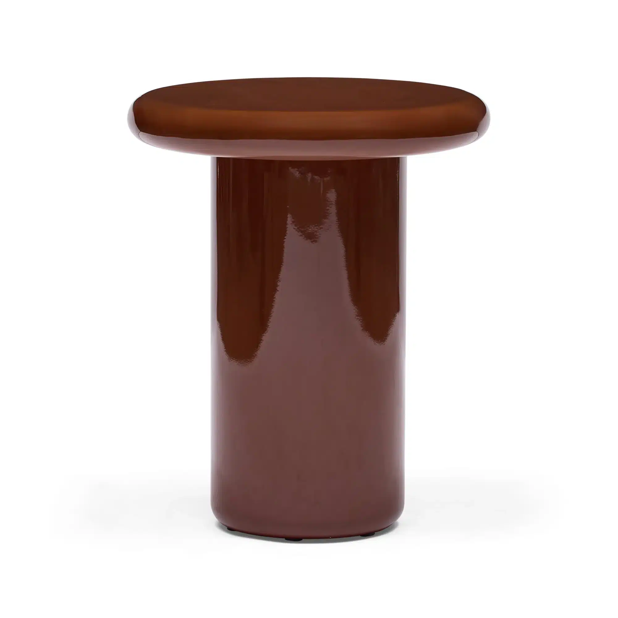 Bold yet beautifully restrained, this sculptural side table is defined by its confident cylindrical base and softly rounded top. Finished in a rich, high-gloss auburn lacquer, this piece brings depth and quiet richness to a space while maintaining a clean, contemporary profile.