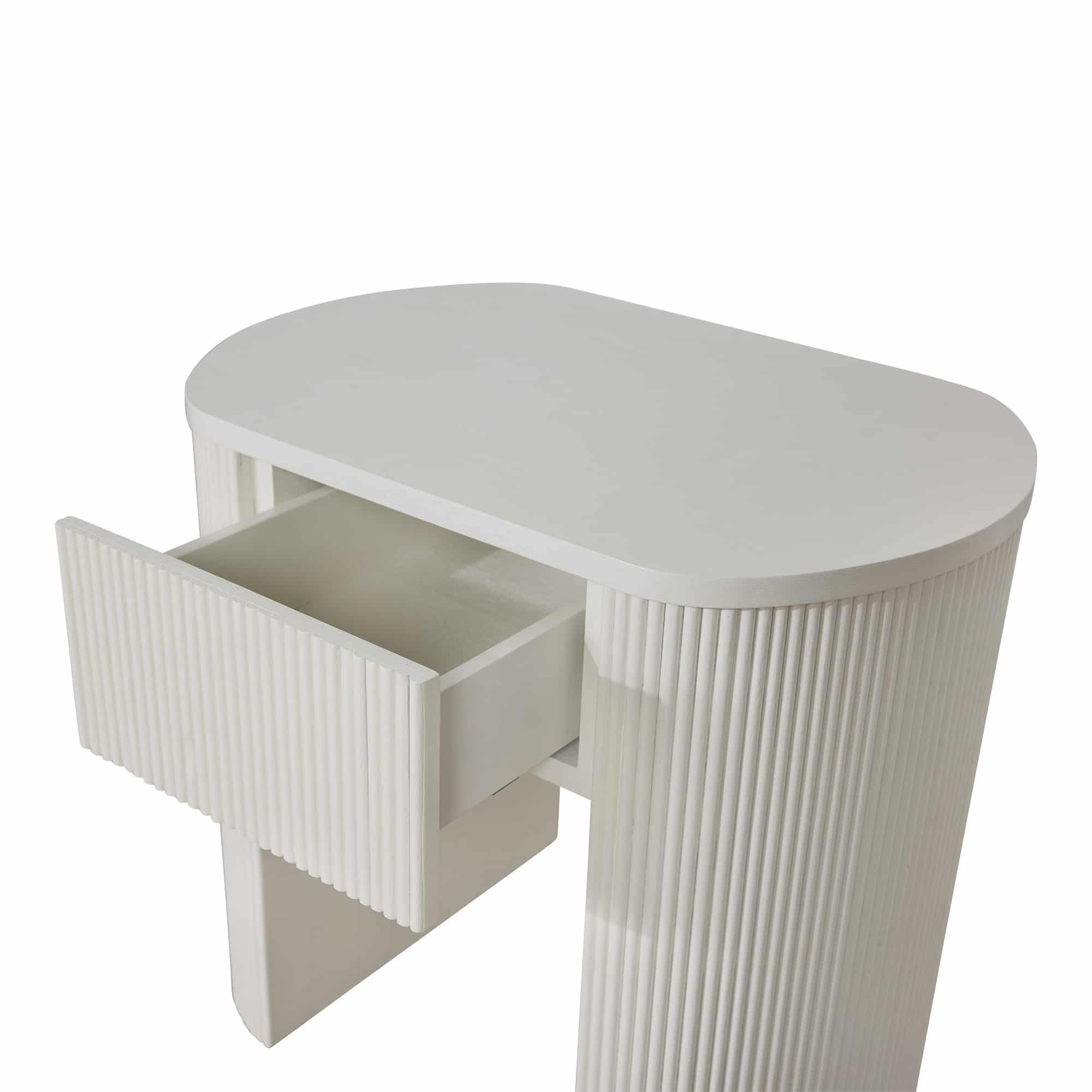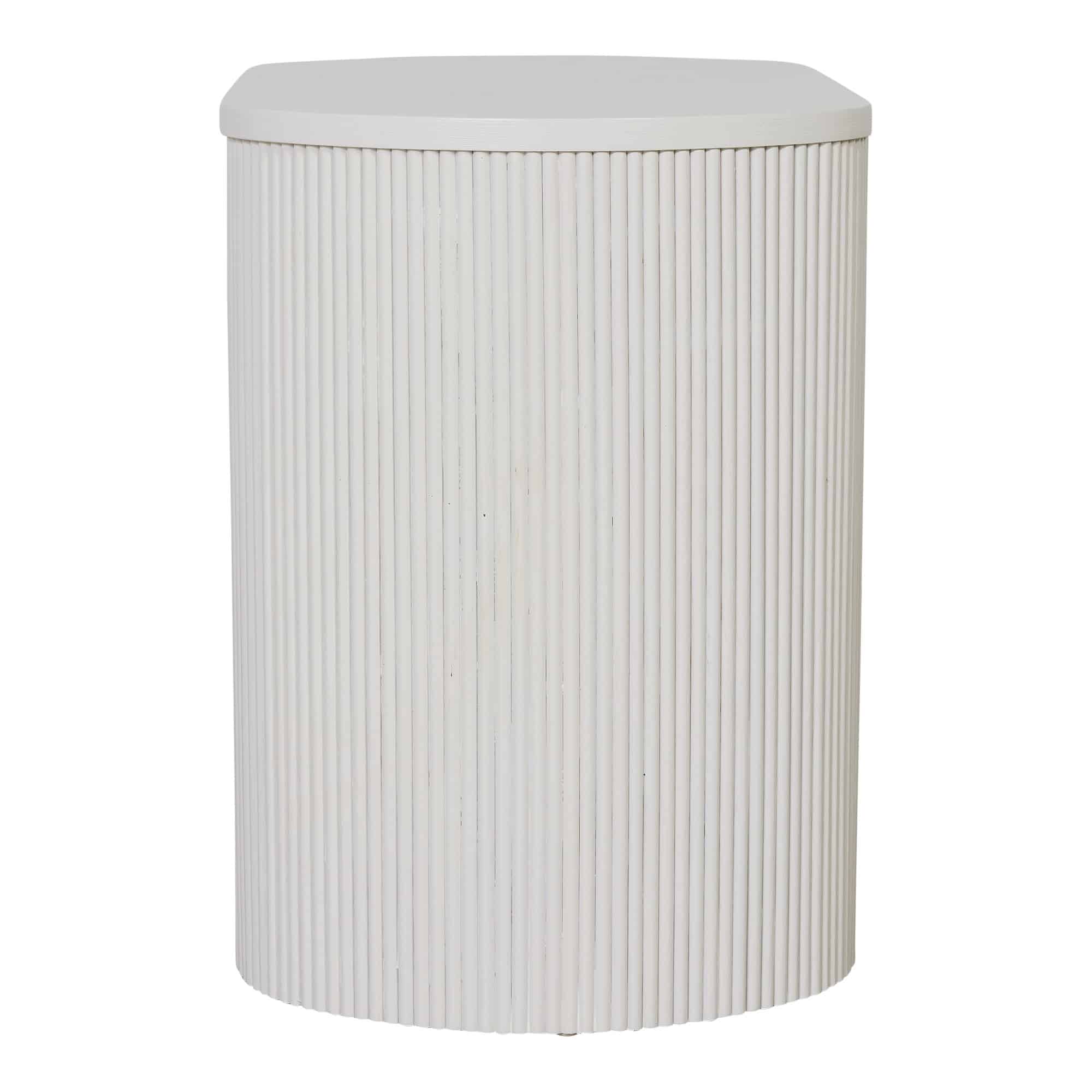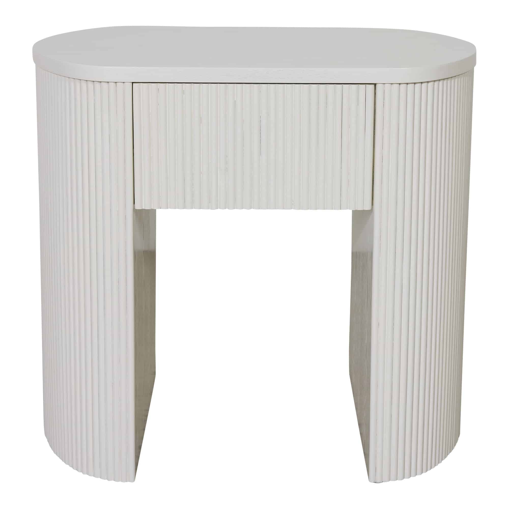 Elevate your bedroom scheme with this sleek curved bedside table, featuring stunning narrow fluted timber detailing. With it's elegant rounded silhouette, the Suki Bedside Table adds sophistication to your property styling with a beautifully organic touch. Designed to suit a variety of styles and also available in Black and Oak.