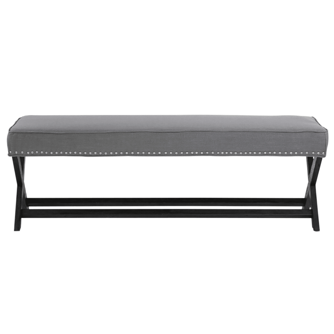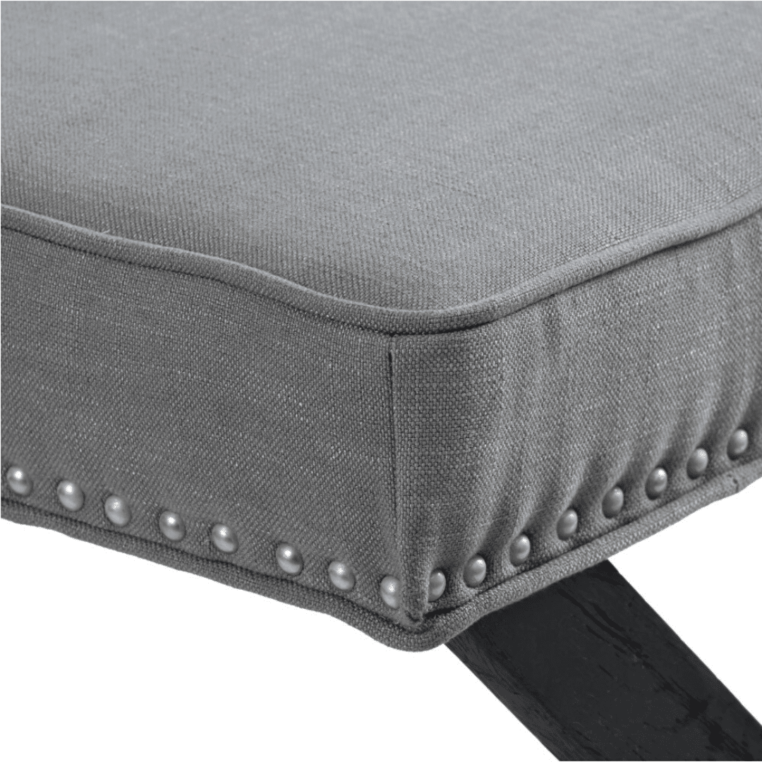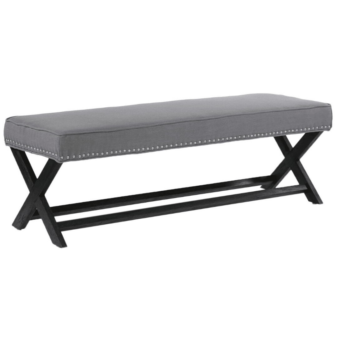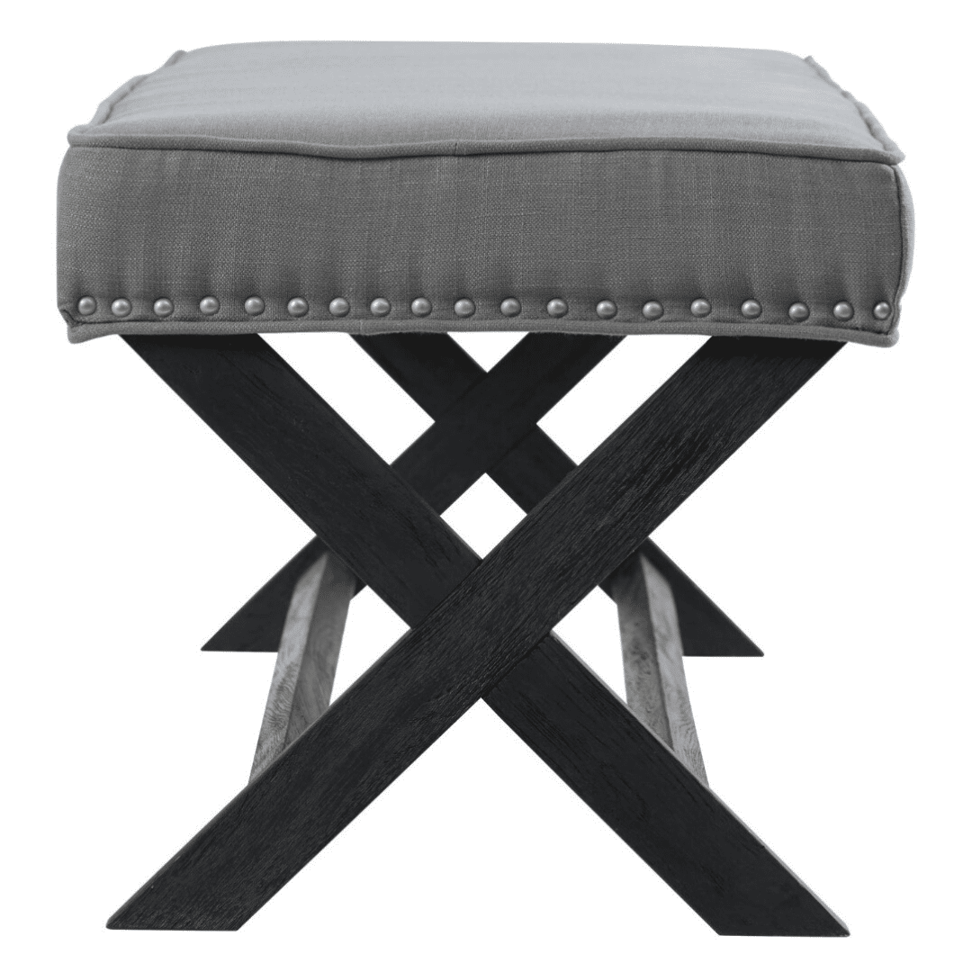 Featuring an upholstered seat with metal stud detailing and black X-shaped legs with a connecting beam for a well-balanced design. This elegant piece showcases a timeless design and would suit a more formal, luxurious property styling brief. The Verona Ottoman works beautifully at the foot of a bed, for occasional seating or can even be used as a coffee table.
